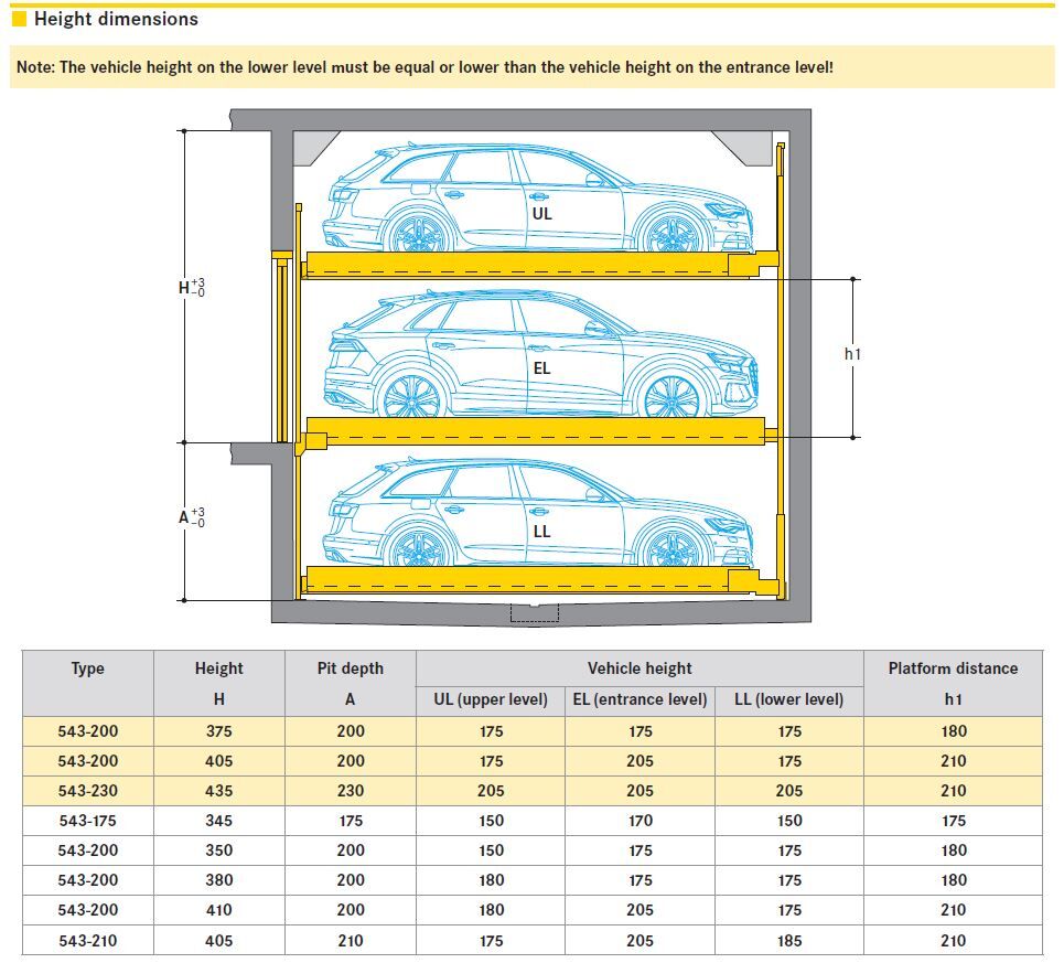 The most compact space saving combilift for parking on 3 levels above each other. The entry is always at the central level. 10 grids can be arranged beside one another. The user selects his place via operation panel or remote control. The cars are safely parked behind sliding doors which can only be opened once the requested parking place has reached the required position.