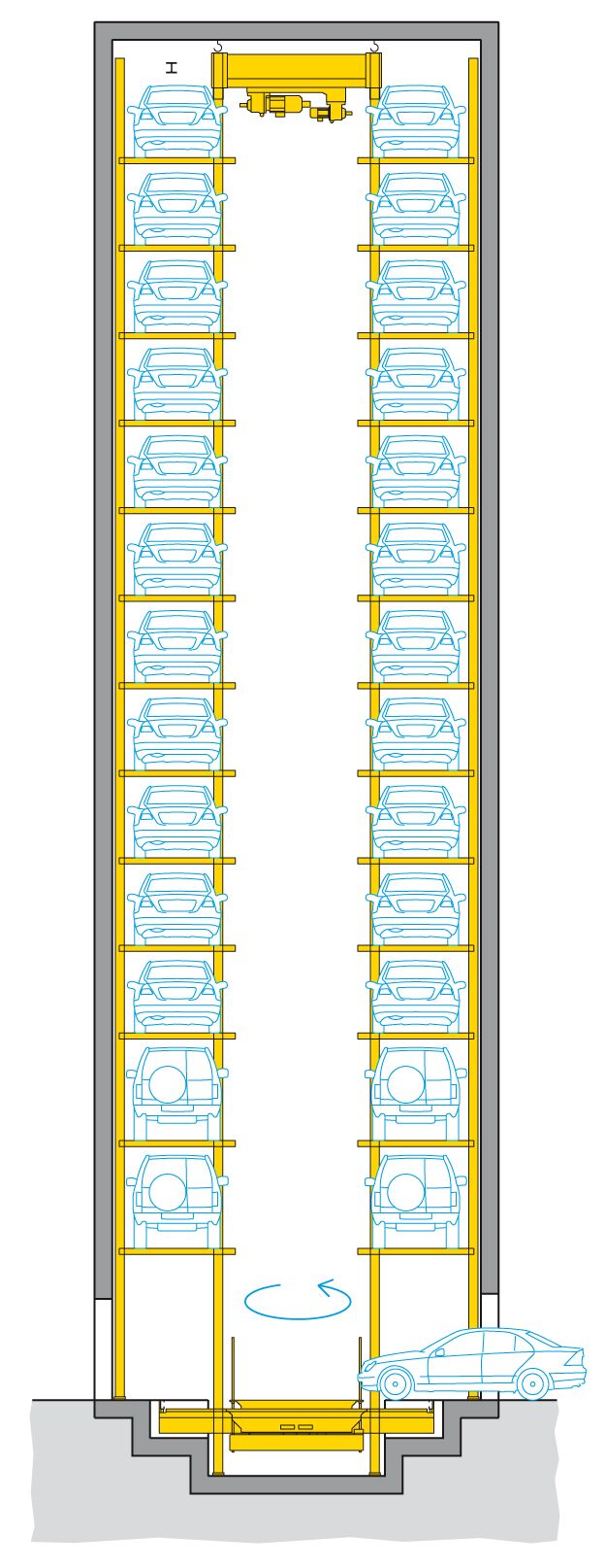 The WÖHR Parksafe 580 system is accessed via Malthouse Lane at the rear of the tower. Users are guided onto a user friendly parking pallet by laser scanners which check the dimensions of the car and ensure that it is correctly parked. Once the user has exited the transfer cabin all doors are locked for safety, the car is turned 90⁰ and lifted to the closest suitable parking bay. An empty pallet is then returned to the entrance cabin ready for the next car.