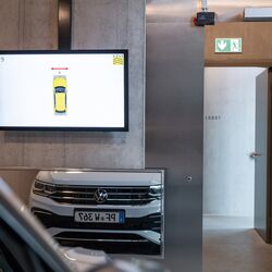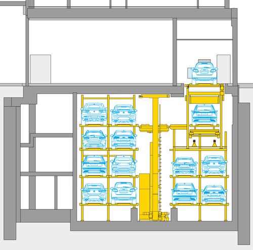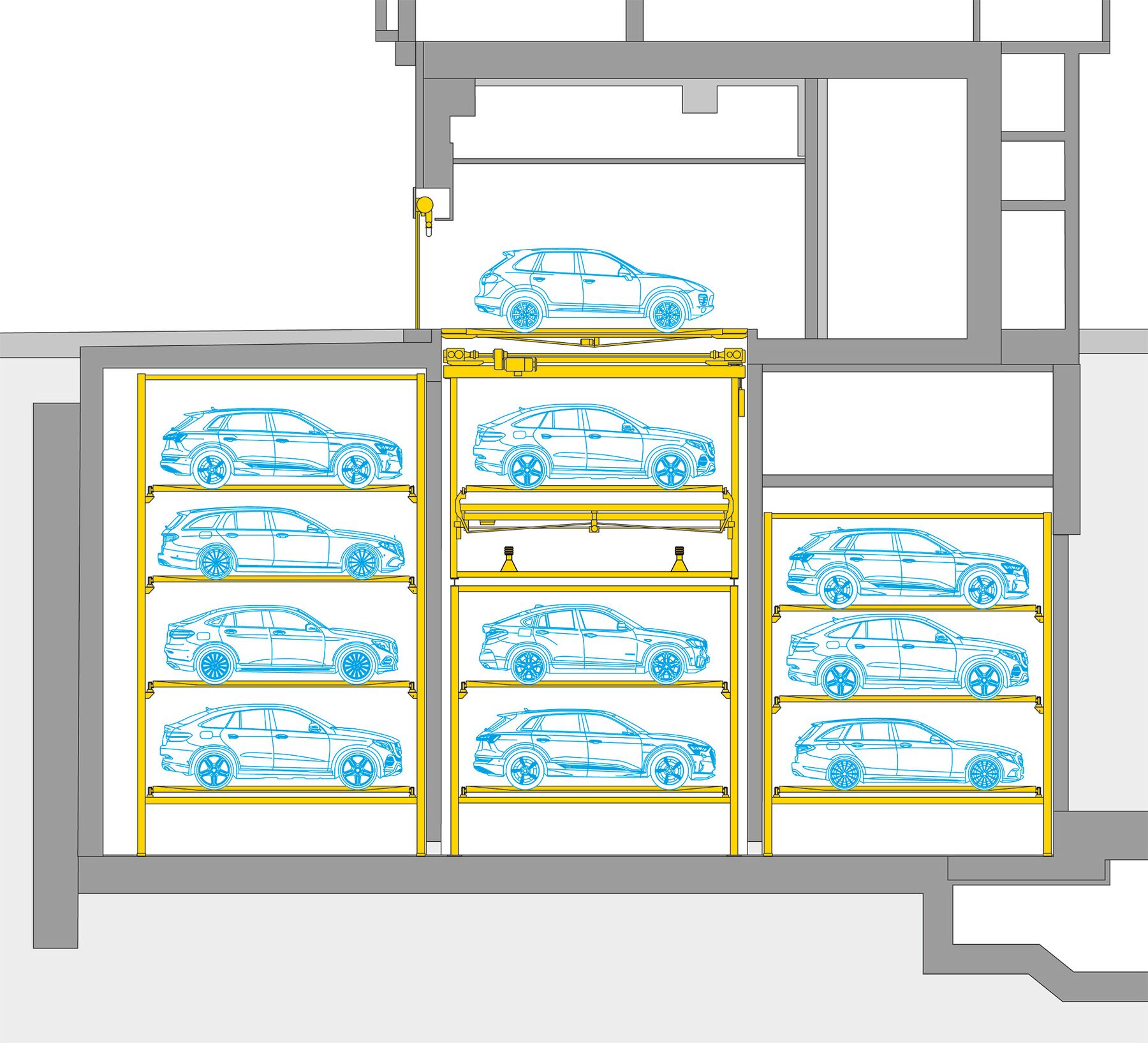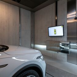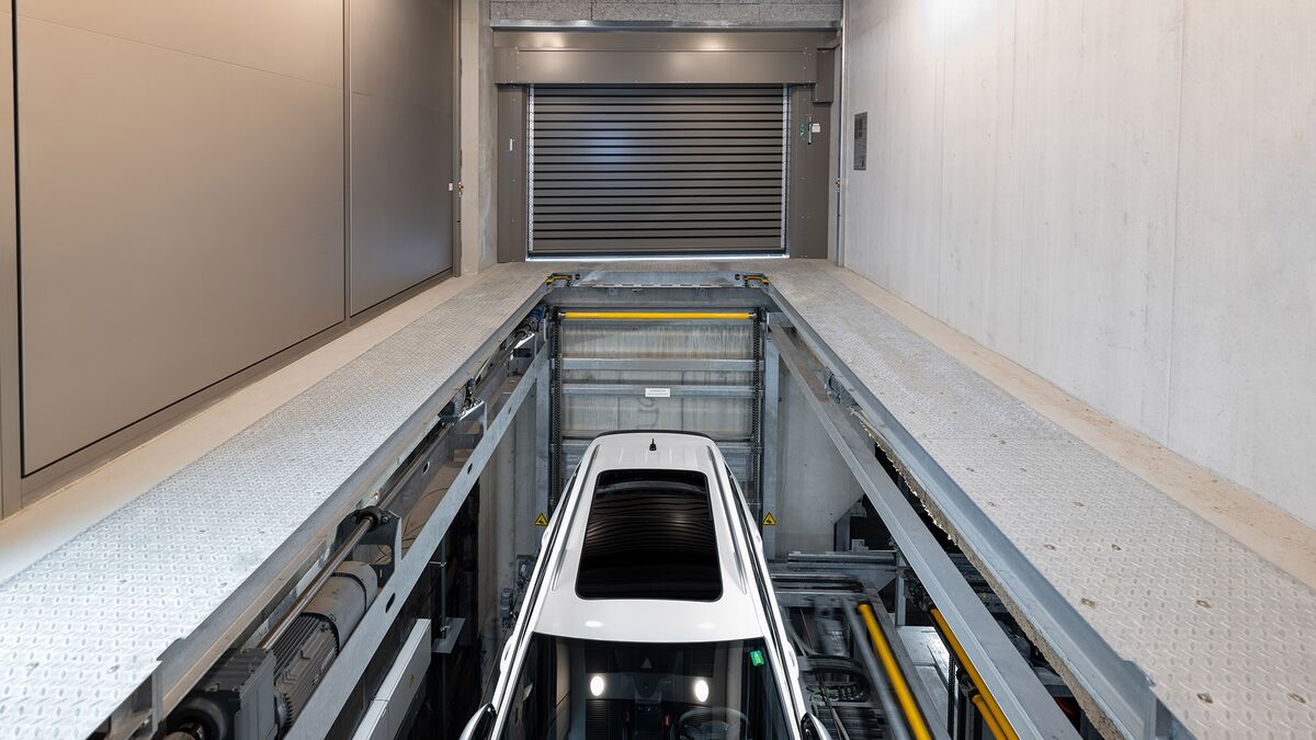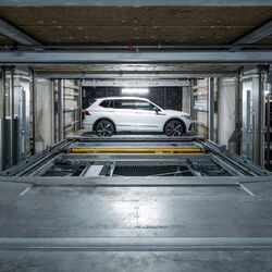 The Franklinturm also fulfils important public space functions. In addition to the ramp to the public bicycle garage, deliveries to and from the station's ShopVille also take place on the ground floor of the tower. The adjacent ‘WÖHR Multiparker 740’ parking system efficiently integrates 38 car parking spaces for the tenants in the building. Once the vehicles have been parked in the transfer cabin, they are automatically removed within approx. 139 to 222 seconds and parked in the four-storey high-bay warehouse in the basement. Depending on the vehicle height, 21 parking spaces up to max. 2.00 m and 17 parking spaces up to 1.70 m are available for vehicle weights up to max. 3.00 tonnes. The 360° swivelling device in the transfer cabin enables convenient parking and unparking in the direction of travel.