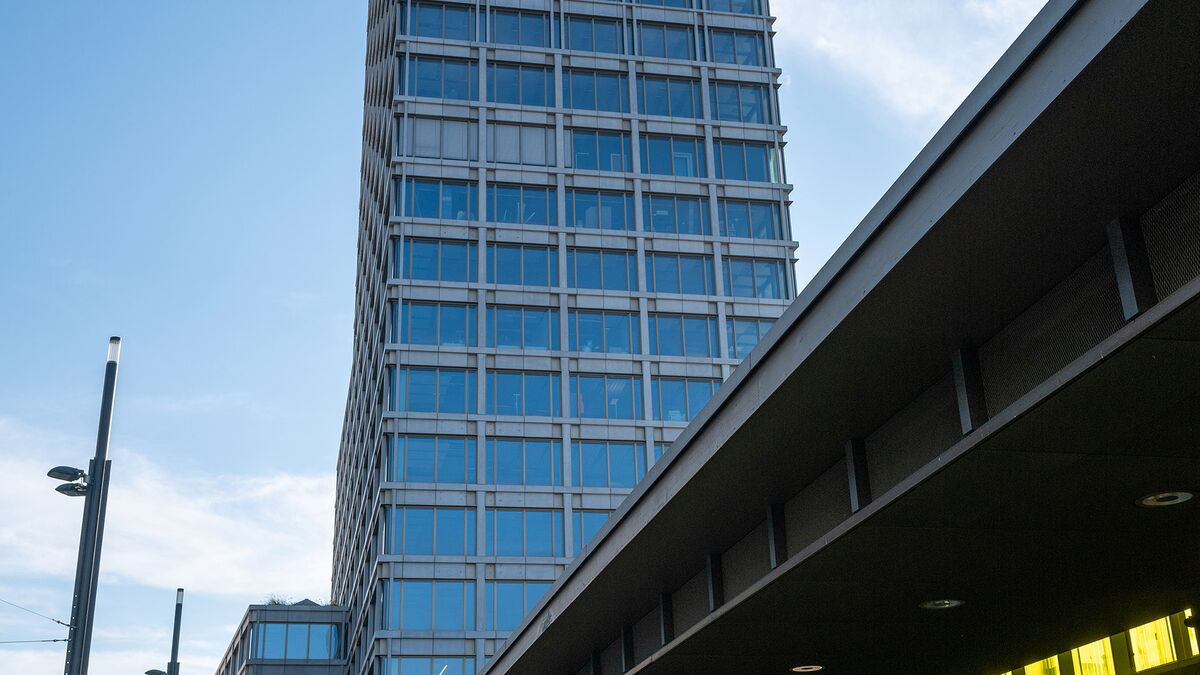 The structural requirements of the high-rise building in particular presented the planners with design challenges. In order to realise a high-rise building on the extremely narrow perimeter between the railway tracks and the road, damage caused by the static forces of the tall building had to be prevented. Added to this was the unstable soil structure and the smooth tunnel of the Zurich waste disposal and recycling company that runs 30 metres underground. A stable foundation was created using a combination of shallow and pile foundations with a deep foundation over three basement levels. The striking cantilever and rotation of the tower also had a considerable influence on the statics. Vertical and horizontal prestressing was used to prevent the building from tilting and to counteract the enormous wind forces. This technique is known from bridge construction and is rarely used in buildings; specifically, pipes with anchor strands were laid in the walls, which carry steel cables tensioned with high loads. Several hundred of these cables were needed to ensure the structural balance of the tower block. The building also had to be protected against vibrations caused by earthquakes and railway operations.