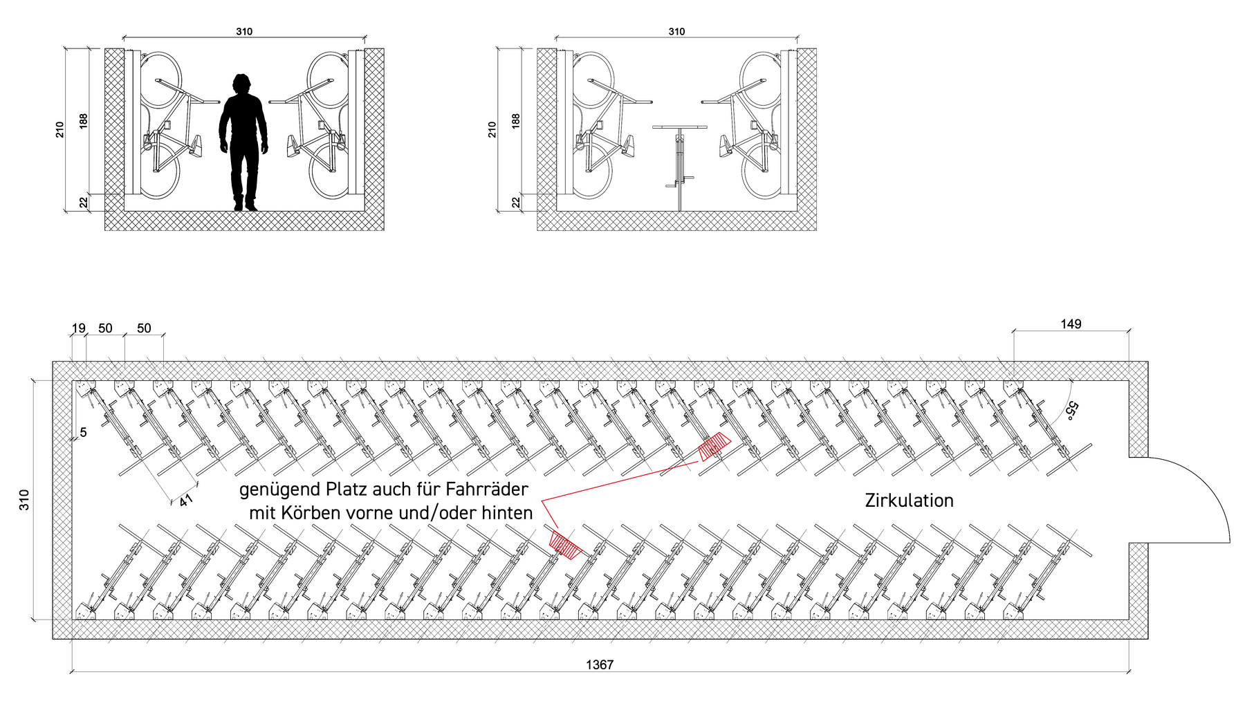 Les systèmes de stationnement pour vélos existants nécessitent soit une adaptation de la hauteur du local (supérieure à 210 cm), soit une augmentation de la surface du local afin d'obtenir le nombre prescrit de places de stationnement pour vélos. Cependant, ces modifications de la construction sont des facteurs de coûts très importants. C'est pourquoi nous avons développé le Bike-Parking-Lift® afin d'obtenir un système global parfait comprenant l'aménagement de l'espace, y compris un système de stationnement pour vélos coordonné de manière optimale avec une hauteur de pièce idéale de 210 cm pour les sous-sols qui doivent répondre à des exigences élevées :
