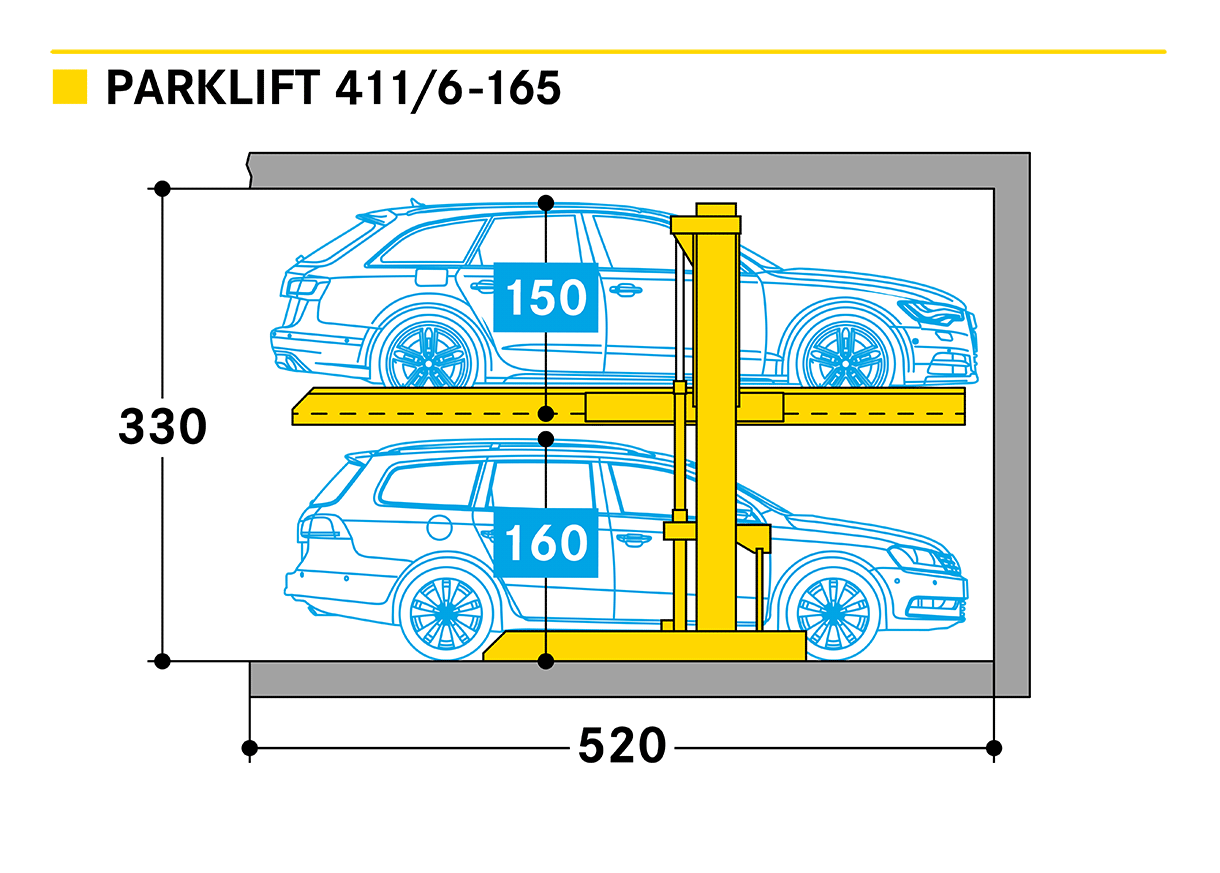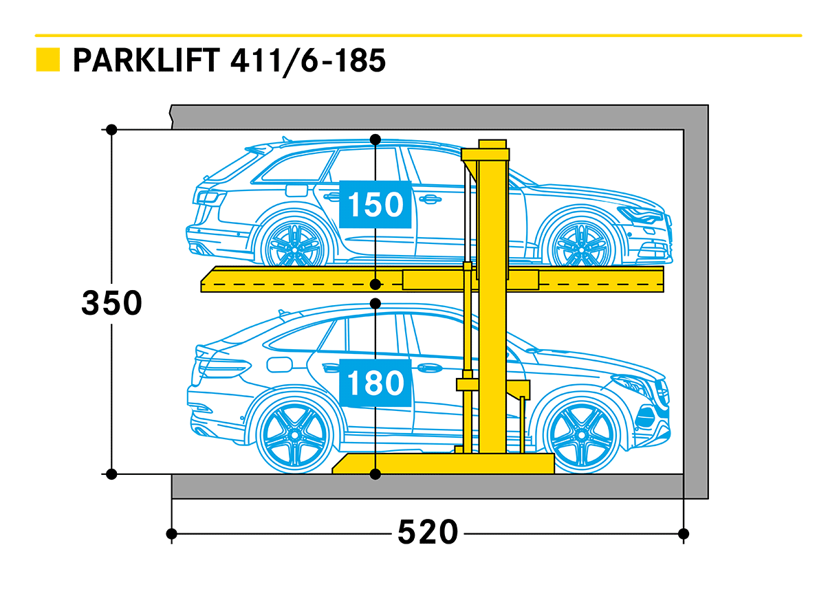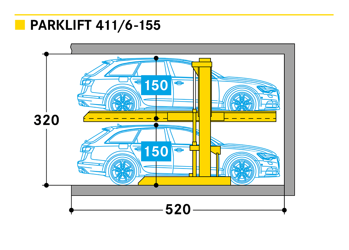 Dépendant signifie que la place inférieure doit être libérée pour permettre l'utilisation de la place supérieure. Avec un petit équipement supplémentaire, le Parklift 411 peut aussi être installé en extérieur. L'installation simple est conçue pour 2 véhicules.