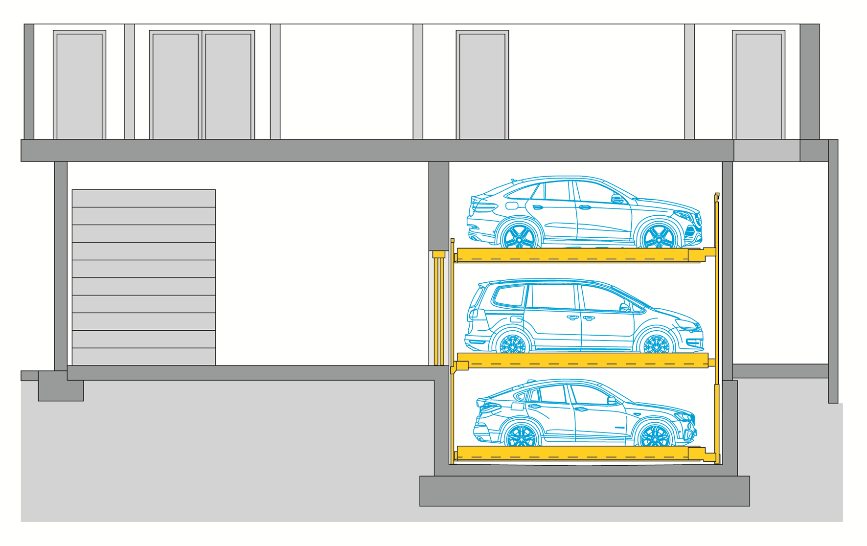 Le Combilift 543 est un système de parking semi-automatique. Le principe de base du Combilift 543 est qu'il y a un niveau dans une fosse, un niveau au niveau de la surface de roulement et un niveau au-dessus. 3 niveaux et tous les véhicules peuvent être approchés individuellement sans qu'il soit nécessaire de sortir un véhicule du parking. En déplaçant les plateaux de stationnement, il est possible de se garer sur tous les emplacements de manière totalement indépendante. Grâce aux larges plates-formes (270 cm), il est particulièrement confortable de se garer et de sortir du parking.