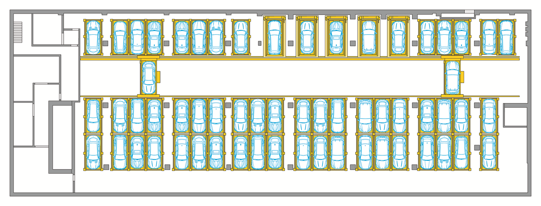 C'est pourquoi le système de parking entièrement automatique Multiparker730 de WÖHR a été choisi pour fournir les places de stationnement nécessaires à l'extension. Sur seulement environ 2.400 m², le système peut accueillir 160 véhicules - dont des véhicules électriques !